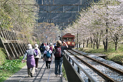 トロッコ線路脇の桜の木はすくすくと成長し、架線に覆い被さっています。 一斉に咲き咲き、桜のトンネルを作っています。 |