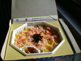 | 押し寿し弁当越後の小昼(こびり) (ホテルセンチュリーイカヤ) 売店で「お買い得だよ〜!!」って言われて買ったところ 「4種類の押し寿し」と、おかずがぎっしり 一瞬上げ底?!と思わせて、笹の下にももう一組の押し寿しが。 鳥の天ぷらがとってもGood 食後の新潟名物笹団子も入っています。 (平成11年08月01日) |