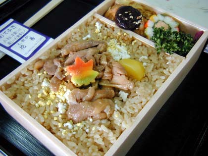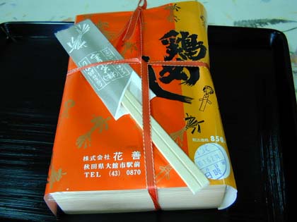 鶏めし弁当 (花善) 大きめの弁当箱に、たっぷりご飯が入ってます。 卵のそぼろの上に比内鳥が乗ってます。 駅の売店(コンビニ)でも買えますが、 駅前に店が有るので、そちらがお勧め。 ほかに、 特上鳥めし(要予約)、特製鳥めし(要予約)、特製スペシャル鳥めし(要予約) も、あるようです。 |