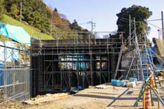国道18号側から見ると 手前側まで鉄筋が組まれています。 最初に鉄筋が組まれていた部分の 3/4ぐらいまで既にコンクリートが 流し込まれています。 |